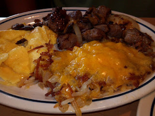 sirloin steak tips dinner with omelette made with a splash of buttermilk and wheat pancake batter for extra fluffiness and a choice of two ingredients with melted hash brown. Served with two buttermilk pancakes with house syrups. We love IHOP, they always have the best food in town! Wink.